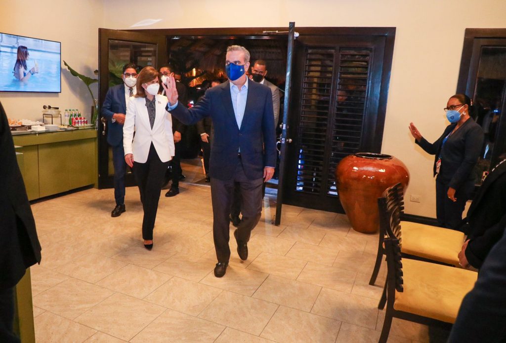 Acompañan los ministros, Administrativo de la Presidencia, José Ignacio Paliza y de Turismo, David Collado. También, Eilyn Beltrán, asistente especial y secretario del gabinete del presidente; Mercedes Pichardo, su asistente personal y el mayor general Celin Rubio, jefe del Cuerpo de Seguridad Presidencial.