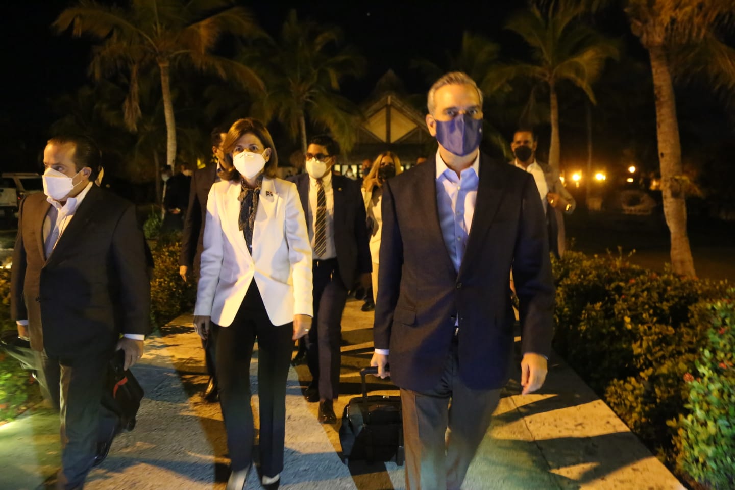 Acompañan los ministros, Administrativo de la Presidencia, José Ignacio Paliza y de Turismo, David Collado. También, Eilyn Beltrán, asistente especial y secretario del gabinete del presidente; Mercedes Pichardo, su asistente personal y el mayor general Celin Rubio, jefe del Cuerpo de Seguridad Presidencial.