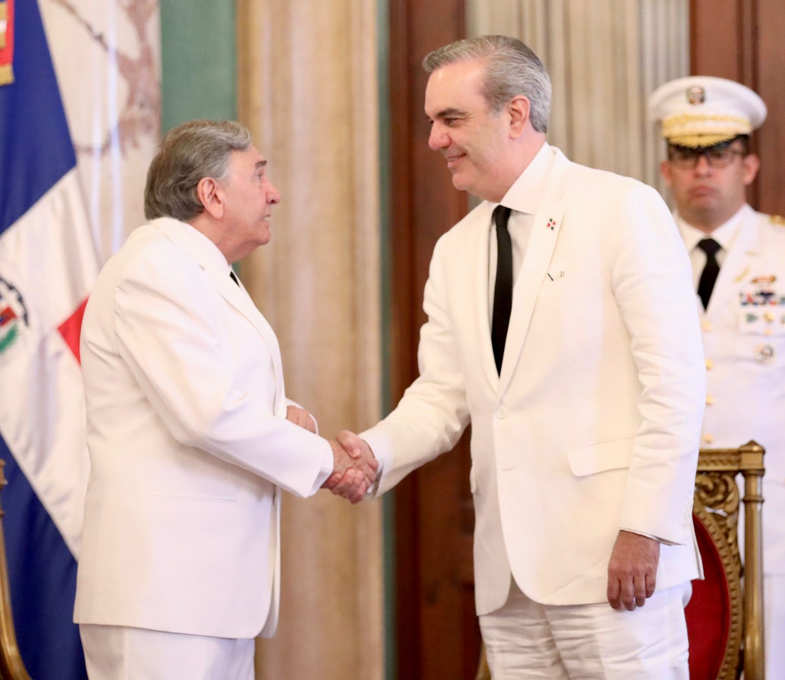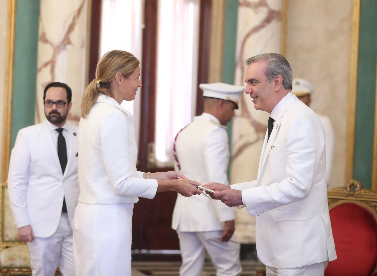 Abinader junto a la vicepresidenta, Raquel Peña y el ministro de Relaciones Exteriores, Roberto Álvarez, recibieron en el Salón de Embajadores a los diplomáticos que presentaron sus credenciales ante el Estado dominicano.