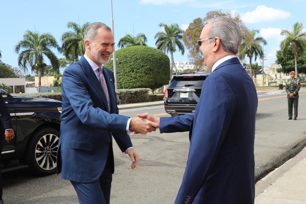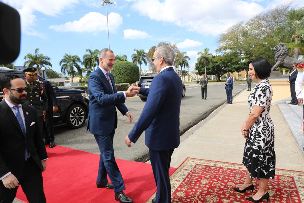 El presidente Abinader, acompañado de la primera dama, Raquel Arbaje, recibió al Rey de España en la escalinata frontal de la Casa de Gobierno a las 10:00 de la mañana y posteriormente, sostuvieron una audiencia privada en el Salón Blanco, junto a las delegaciones de ambos países.