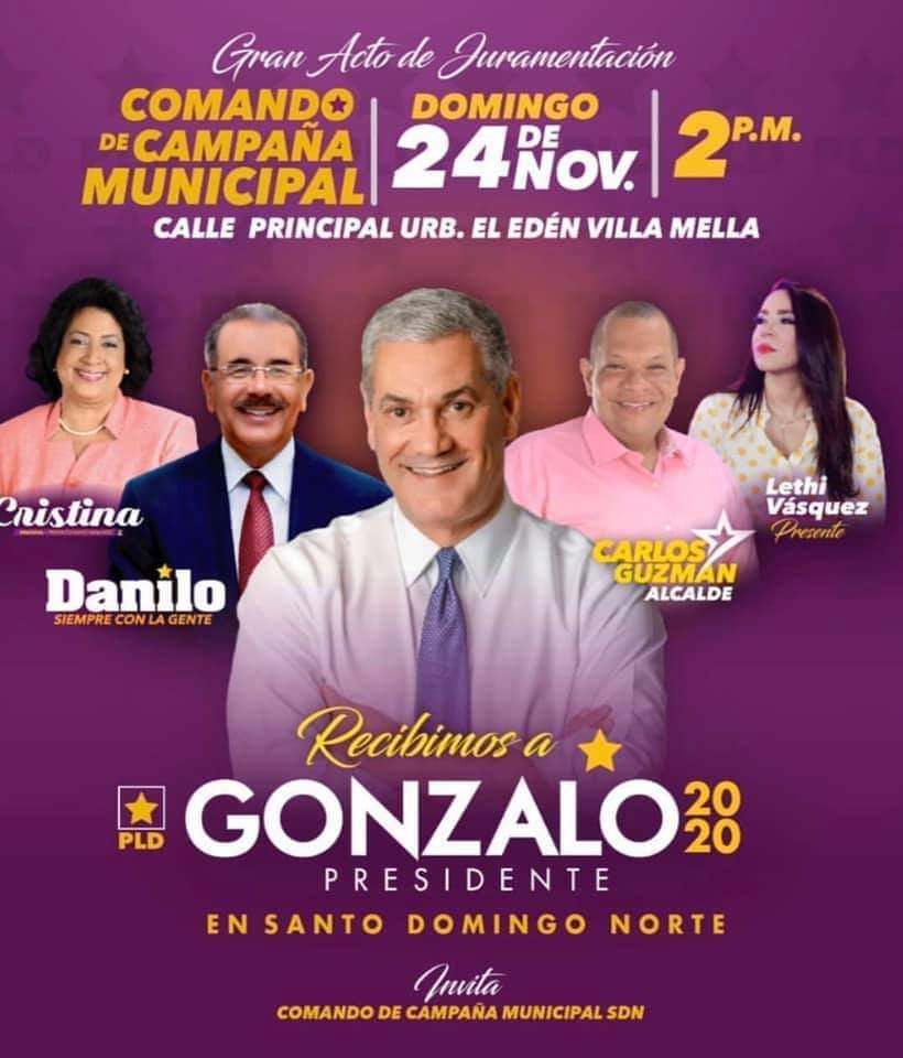 Santo Domingo Norte, RD.- El presidente de la República, Danilo Medina y el candidato presidencial del Partido de la Liberación Dominicana-PLD-Gonzalo Castillo, Juramentaran este domingo el comando de campaña municipal de Santo Domingo Norte y su candidato a alcalde Carlos guzmán de esa organización política.