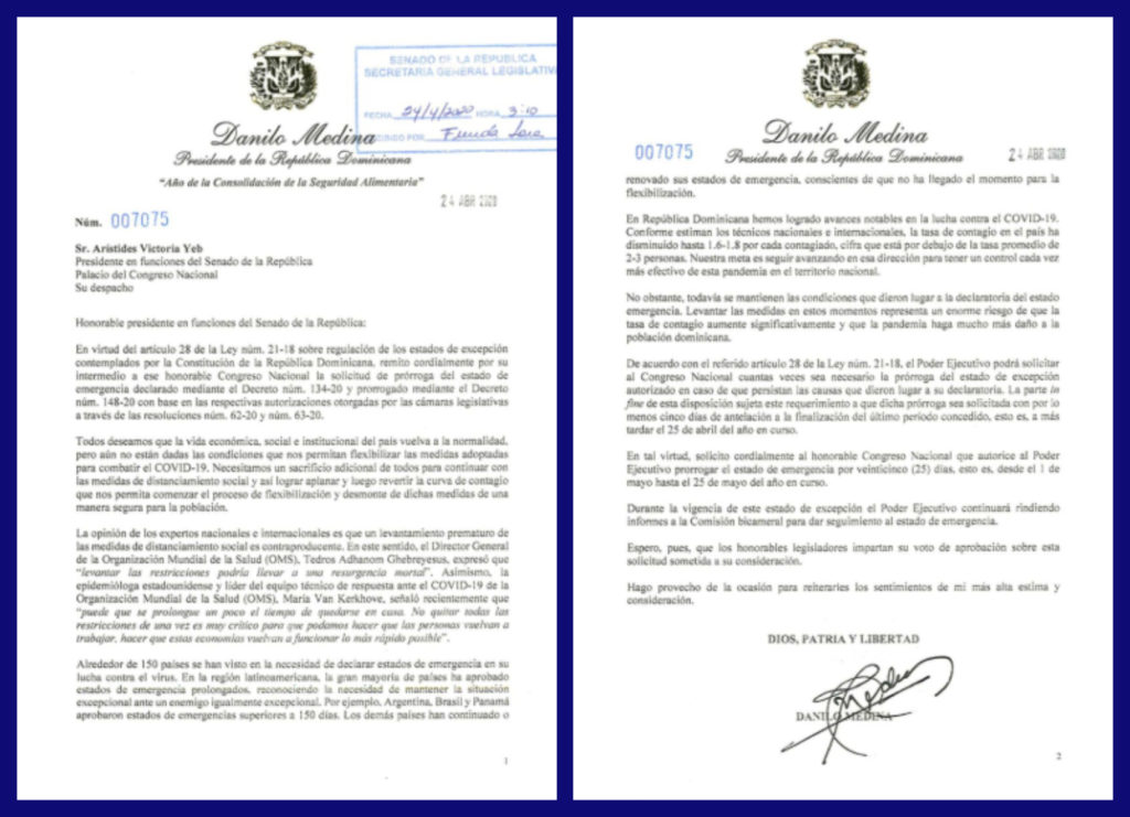 Presidente @DaniloMedina envía comunicación al Congreso Nacional solicitando prórroga del Estado de Emergencia hasta el 25 de mayo. #CoronavirusRD # Covid_19 #coronavirus