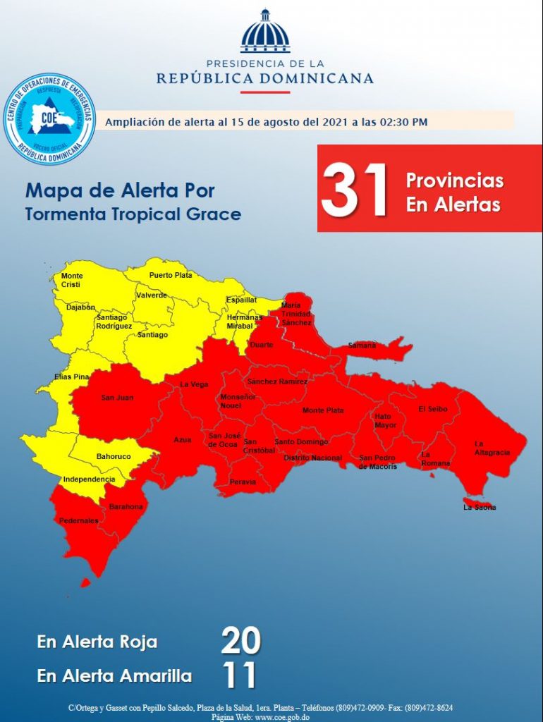 En alerta roja se encuentran las provincias: La Altagracia, La Romana, San Cristóbal, El Seibo, Samaná, María Trinidad Sánchez, Santo Domingo, Barahona, San Pedro de Macorís, Peravia, San José de Ocoa, San Juan, Sánchez Ramírez, Monte Plata, Hato Mayor, Duarte, La Vega, Monseñor Nouel, Azua y Pedernales