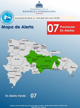 El Centro de Operaciones de Emergencias (COE), prohibió el uso de balnearios en las provincias Monte Plata, El Gran Santo Domingo, La Vega,  Hato Mayor,  Monseñor Nouel, San Cristóba l y  Sánchez Ramírez, debido a que estas se encuentran en alerta verde.