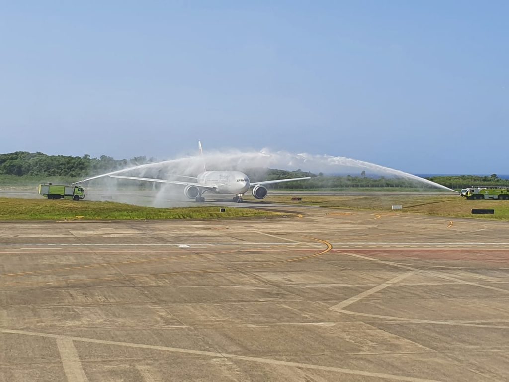 A su llegada a pista, la aeronave de Nordwind Airlines recibió el bautizo protocolar por dos camiones de bomberos previo al acto de festejo que prepararon autoridades a turistas rusos y la tripulación, a ritmo de folklore y merengue típico de parte del Ballet Folklórico del Mitur que dirige Oscar Batista.