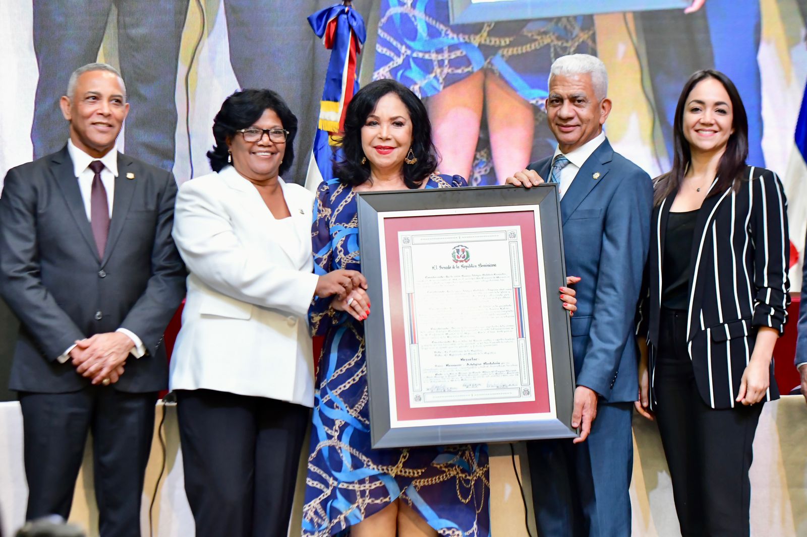 SAN FRANCISCO DE MACORÍS.- El Senado de la República entregó varios pergaminos de reconocimientos a instituciones y personalidades de la provincia Duarte, entre estos a la cantante Adalgisa Pantalón, y póstumo al exsenador y radiodifusor Julio Antonio González Burell (Machacho), y al doctor Ángel María Gastón Calderón.