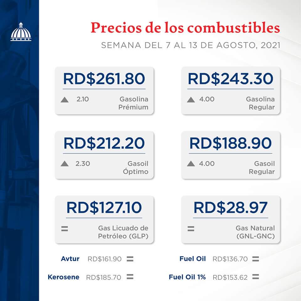 En el caso de la Gasolina Premium costará RD$261.80 por galón, sube RD$2.10; Gasolina Regular RD$243.30 por galón, sube RD$4.00; Gasoil Regular RD$188.90 por galón, sube RD$4.00 y el Gasoil Óptimo RD$212.20 por galón, para un aumento de RD$2.30.