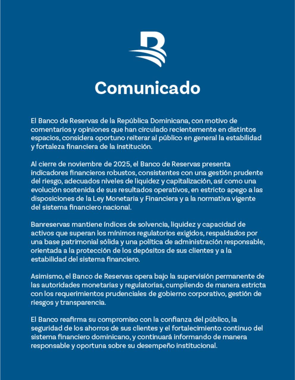 Santo Domingo, R.D.– Ante informaciones y valoraciones difundidas recientemente en distintos espacios, el Banco de Reservas de la República Dominicana reiteró a la ciudadanía que la institución mantiene una posición financiera firme, sustentada en una gestión responsable y en el cumplimiento estricto de las normas que rigen el sistema financiero nacional. La entidad informó que, al cierre de noviembre de 2025, exhibe resultados consistentes con una administración prudente del riesgo, adecuados niveles de liquidez y capitalización, así como un desempeño operativo sostenido, todo ello en consonancia con lo establecido en…