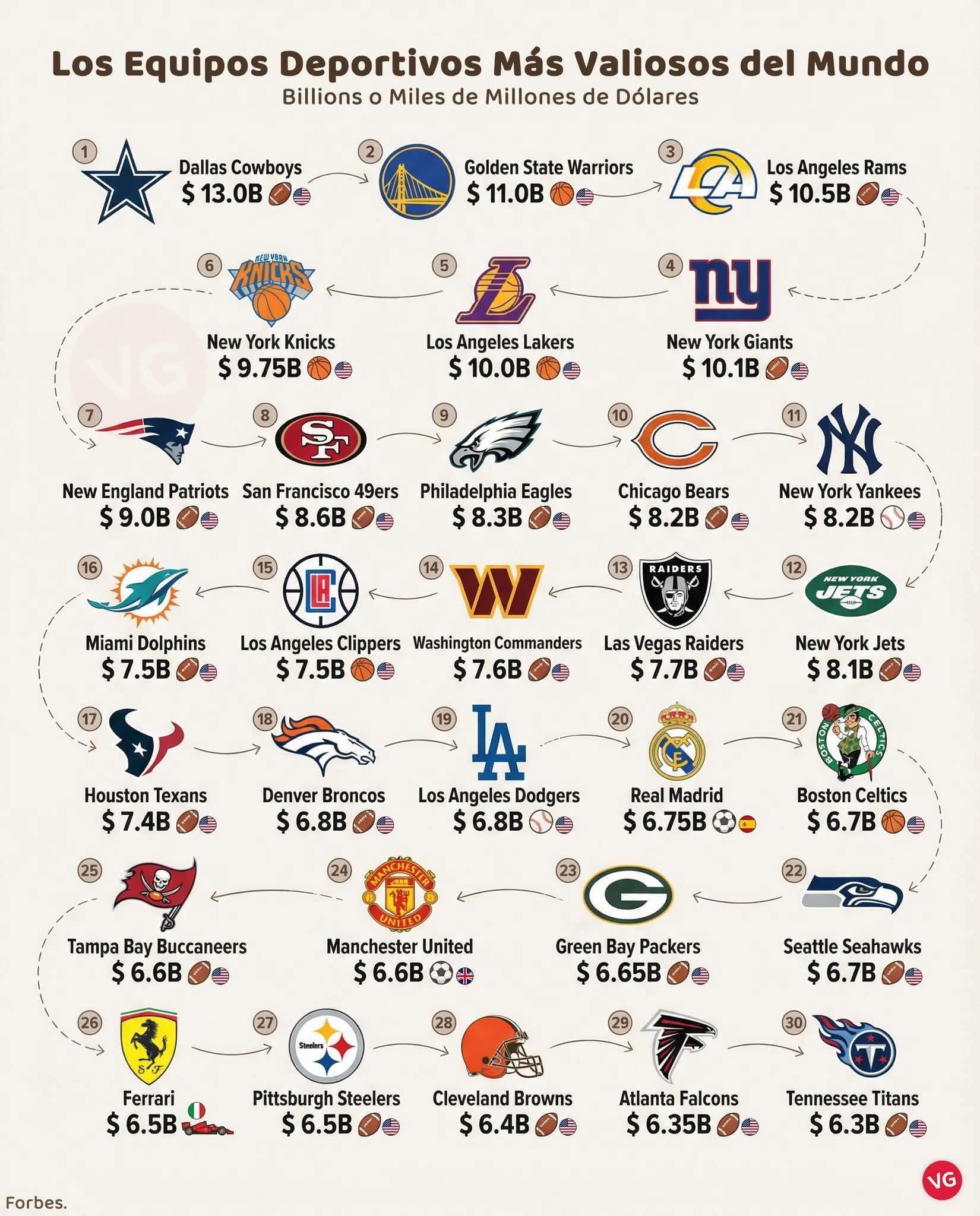 Luis Manuel Ferreras Santo Domingo. El deporte profesional confirmó su estatus como una de las industrias más poderosas del mundo, con franquicias que superan cifras históricas y consolidan su impacto más allá de la competencia. De acuerdo con el más reciente ranking de Forbes, los Dallas Cowboys encabezan la lista de los equipos deportivos más valiosos del planeta, con una valoración estimada en 13 mil millones de dólares, reafirmando el liderazgo de la NFL en el mercado global del entretenimiento deportivo. El dominio estadounidense es abrumador. La NFL y la…