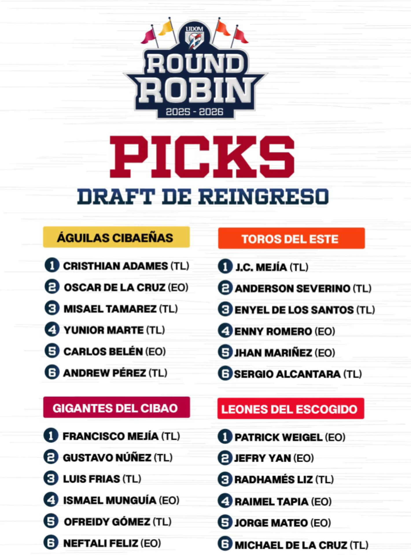 Luis Manuel Ferreras Santo Domingo. Las Águilas Cibaeñas apostaron por fortalecer su profundidad de cara al Round Robin con la selección de Cristhian Adames como su primera elección, seguido de Óscar de la Cruz, Misael Tamarez, Yúnior Marte, Carlos Belén y Andrew Pérez, combinando experiencia y brazos para afrontar la exigente etapa semifinal. Los Toros del Este enfocaron su estrategia en el pitcheo y el balance del roster al escoger a J.C. Mejía en el primer turno, junto a Anderson Severino, Enyel De los Santos, Enny Romero, Jhan Mariñez y…