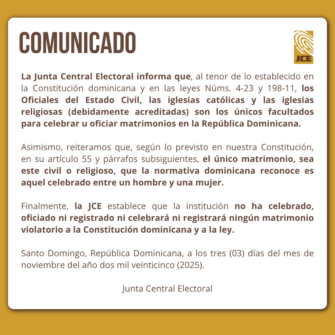 SANTO DOMINGO.– La Junta Central Electoral (JCE) informó que, conforme a lo establecido en la Constitución de la República Dominicana y en las leyes núms. 4-23 y 198-11, los Oficiales del Estado Civil, la Iglesia Católica y las iglesias religiosas debidamente acreditadas son los únicos facultados para celebrar u oficiar matrimonios en el territorio nacional. El órgano electoral precisó que cualquier ceremonia matrimonial realizada fuera de estas disposiciones carece de validez legal, por lo que exhortó a la población a verificar la acreditación de quienes oficien actos de este tipo.…