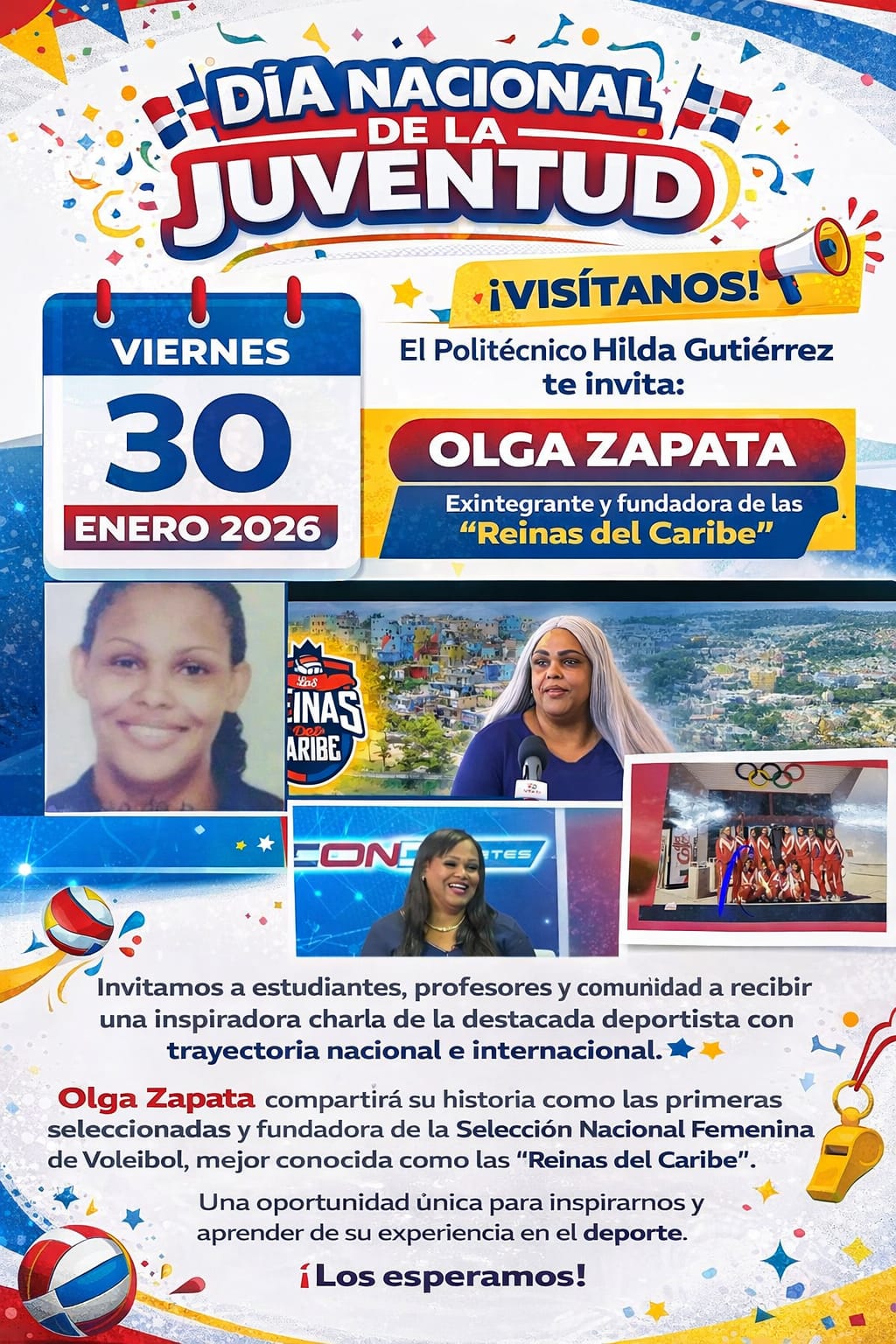 Luis Manuel Ferreras Santo Domingo, RD.– En el marco de la celebración del Día Nacional de la Juventud, el Politécnico Hilda Gutiérrez realizará este viernes 30 de enero de 2026 un encuentro especial con la destacada exvoleibolista dominicana Olga Zapata, exintegrante y fundadora de la emblemática Selección Nacional Femenina de Voleibol, conocida internacionalmente como las “Reinas del Caribe”. La actividad reunirá a estudiantes, docentes y miembros de la comunidad educativa, quienes tendrán la oportunidad de escuchar de primera mano la historia de superación, disciplina y liderazgo de una de las…