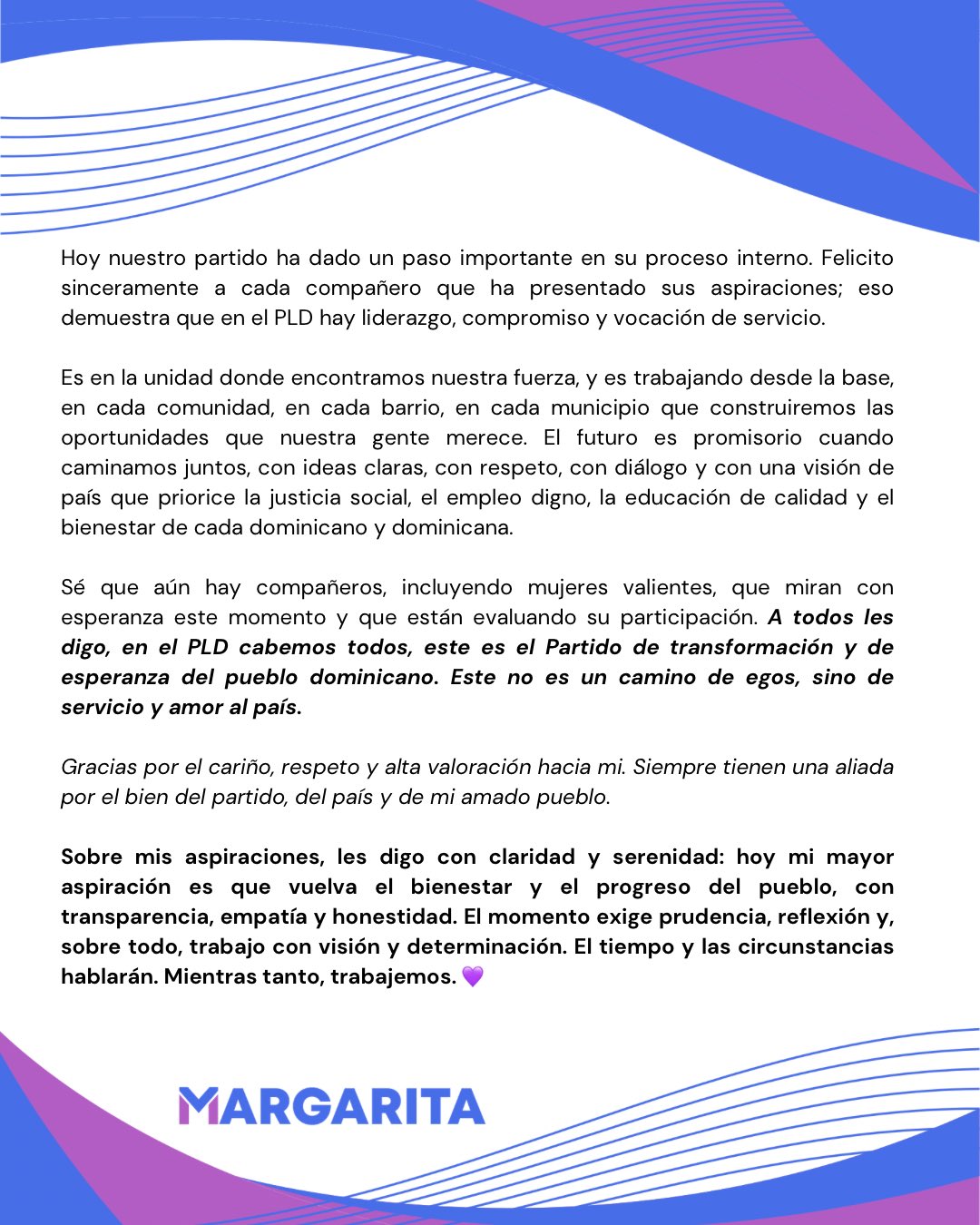 SANTO DOMINGO, RD.– La exvicepresidenta de la República, Margarita Cedeño, fijó su posición pública luego de la publicación del listado de precandidatos presidenciales del Partido de la Liberación Dominicana (PLD), reiterando su compromiso político y su vínculo con los principios históricos de esa organización. A través de un mensaje dirigido a la militancia y a la ciudadanía, Margarita Cedeño aseguró que continuará reafirmando su compromiso con el pueblo dominicano y con las ideas del profesor Juan Bosch, fundador del PLD. En sus declaraciones, subrayó la importancia de mantener la coherencia…