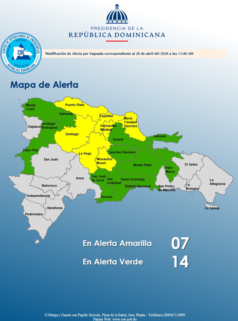 Santo Domingo, República Dominicana.— El Centro de Operaciones de Emergencias (COE) actualizó este 26 de abril los niveles de alerta debido a la incidencia de una vaguada que está generando condiciones de inestabilidad atmosférica sobre gran parte del territorio nacional. El fenómeno favorece el desarrollo de nubosidad convectiva significativa, acompañada de precipitaciones moderadas a fuertes, ráfagas de viento y posibles tronadas aisladas.