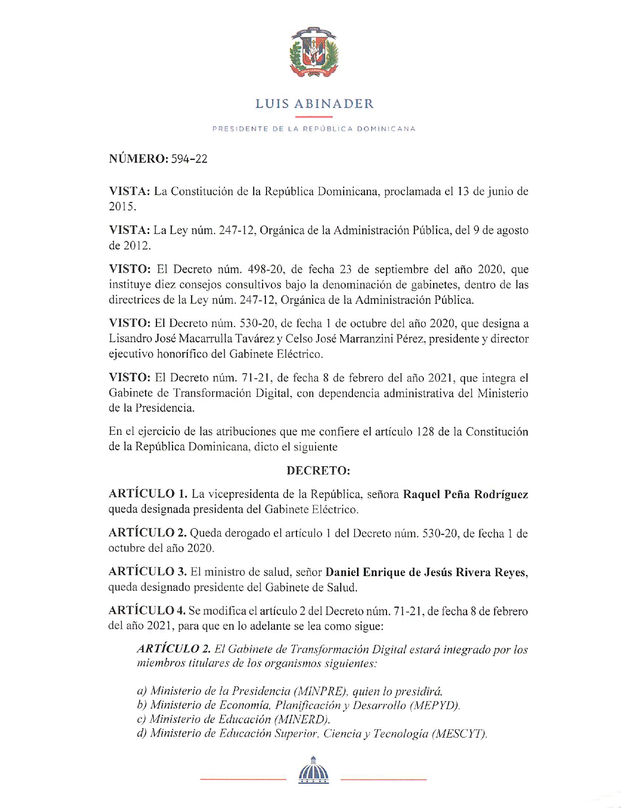 Santo Domingo.- El Poder Ejecutivo emitió el Decreto número 594-22, mediante el cual designa a la vicepresidenta de la República, señora Raquel Peña Rodríguez, como presidenta del Gabinete Eléctrico.